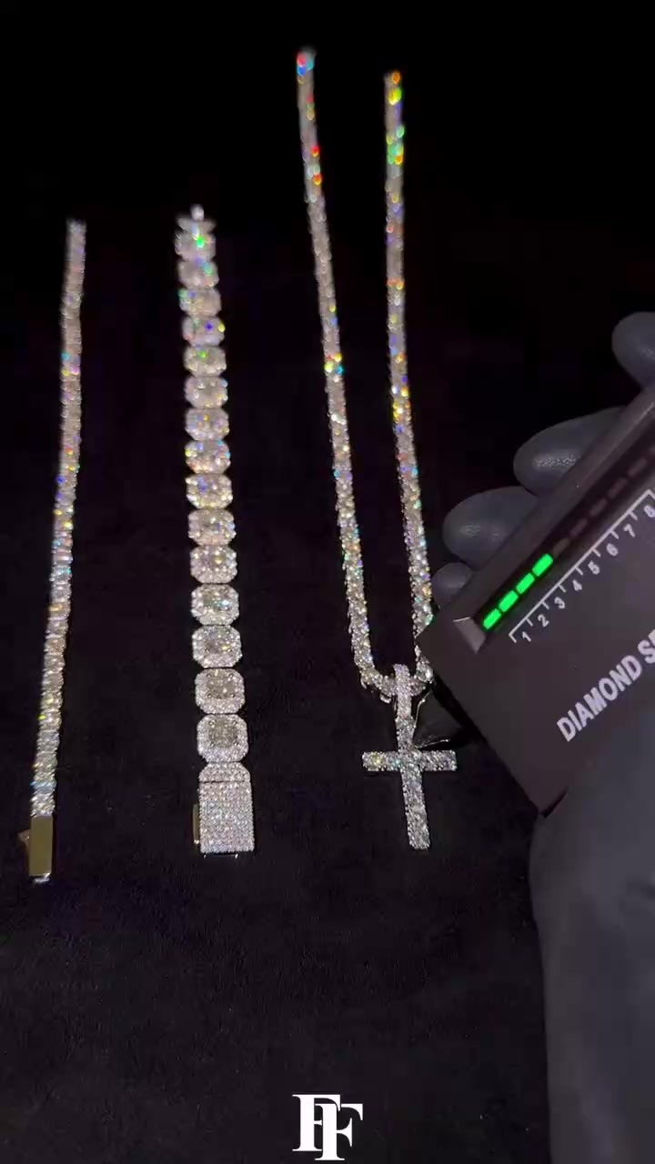 Stacked tennis chains full of diamonds + classic double-sided crosses